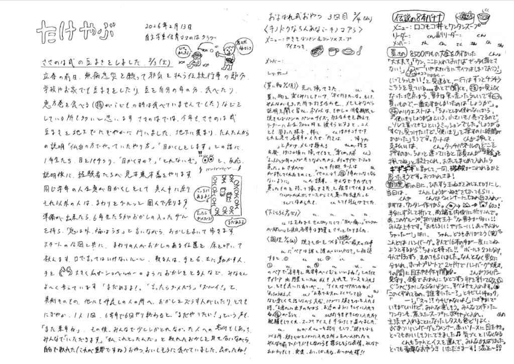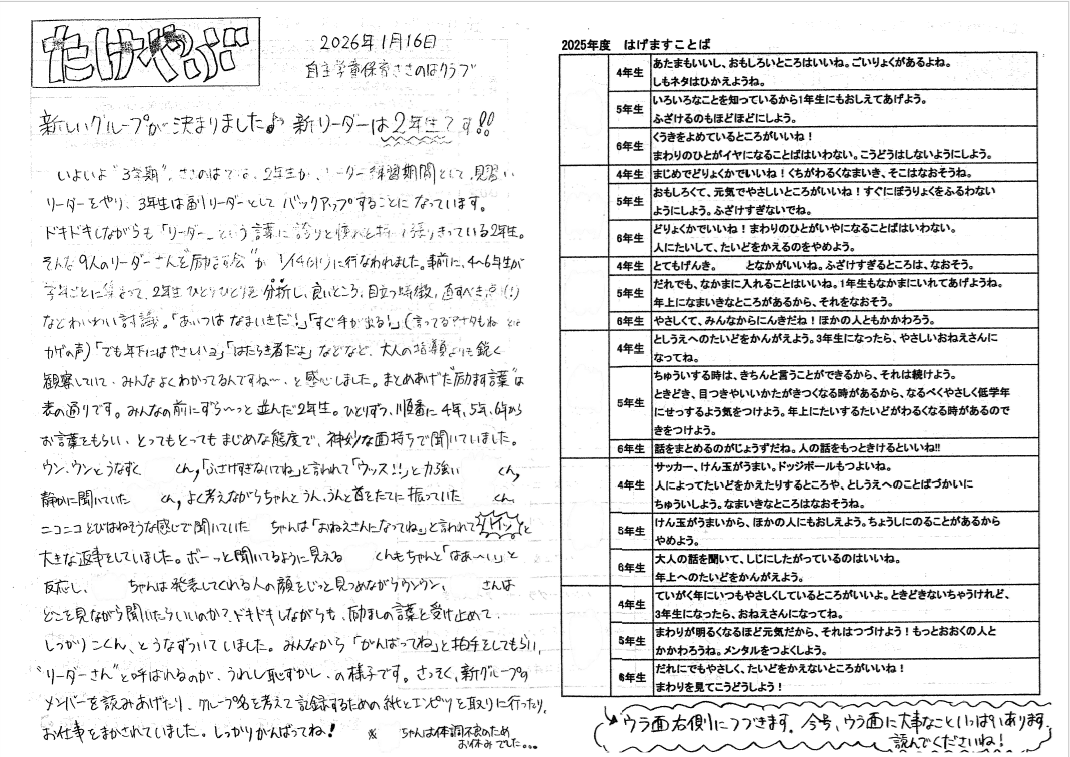 「たけやぶ」とは。ささのはクラブ開設当初より指導員より保護者へむけて毎週発刊しているお便りです。行事や予定の連絡、そして日々の保育やこども達の様子を指導員の目線で書いています。なんといっても一番の特徴は40年間、手書きで作成し続けているという事です。その中から抜粋してホームページ上で掲載していきます。