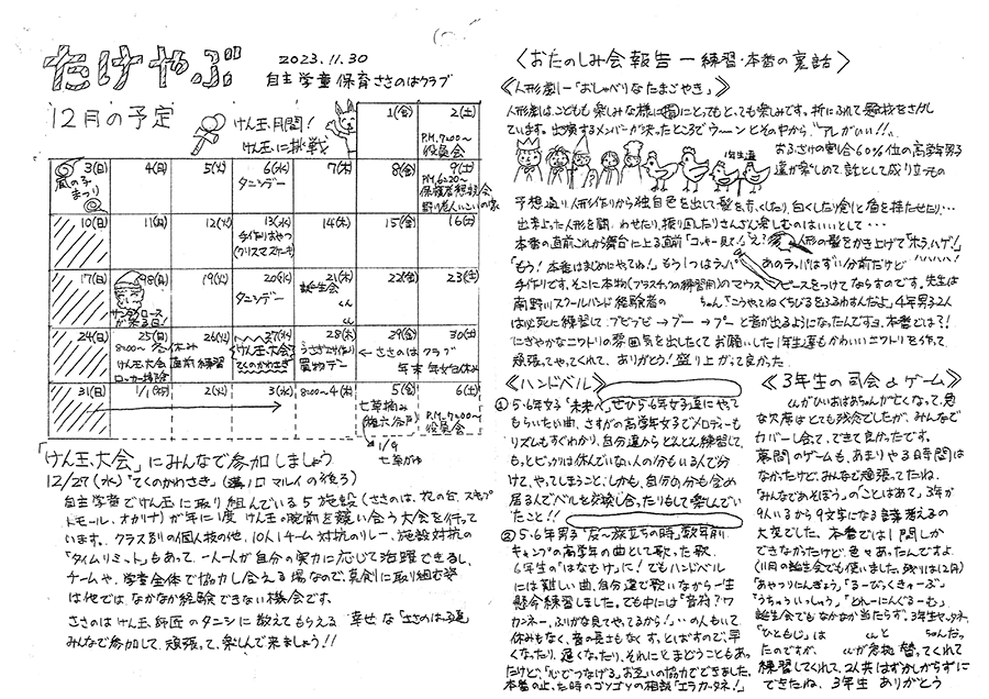 2023年11月30日 2023-11-30 最終更新日時 : 2024-08-17 sasanohaclub 12月の予定と、とても楽しかったお楽しみ会の報告です。 画像をタップするとPDFで見れます。