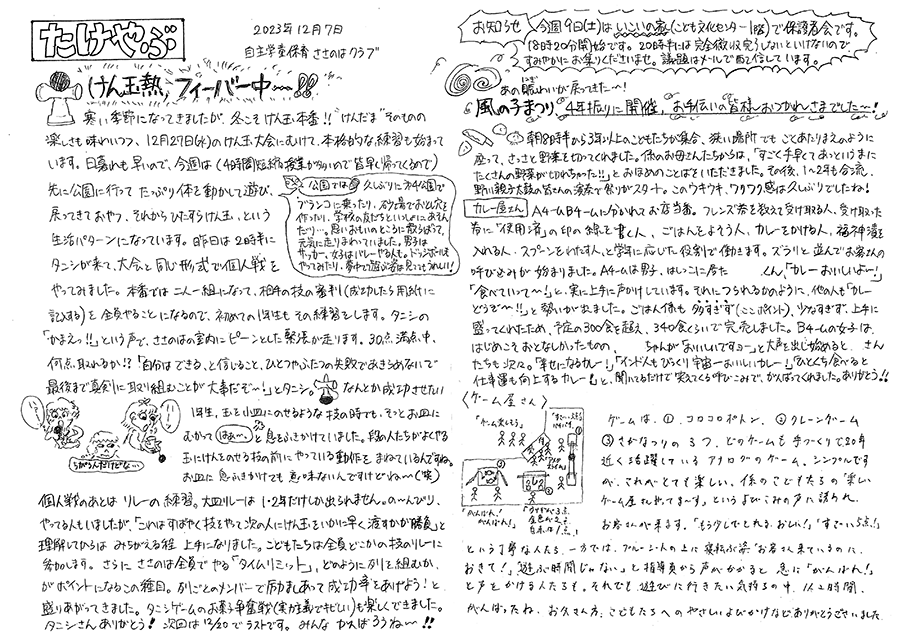 2023年12月7日 2023-12-07 最終更新日時 : 2024-08-17 sasanohaclub けん玉大会に向けた最近の様子と4年ぶりに開催された風の子まつりの報告です。 画像をタップするとPDFで見れます。