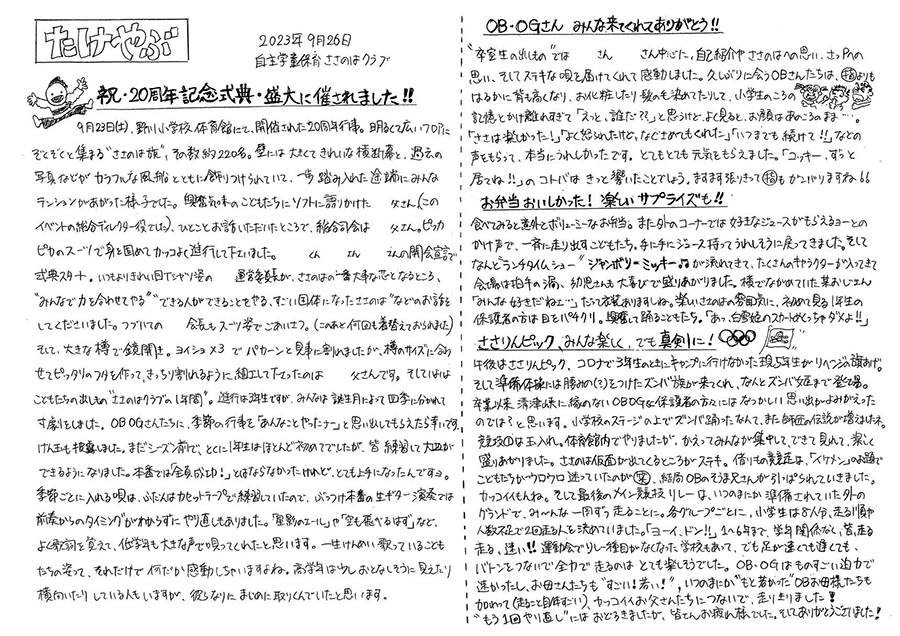2023年9月26日 2023-09-26 最終更新日時 : 2023-10-25 sasanohaclub 盛大に催された自主学童保育ささのはクラブ20周年記念式典の様子です。 画像をタップするとPDFで見れます。