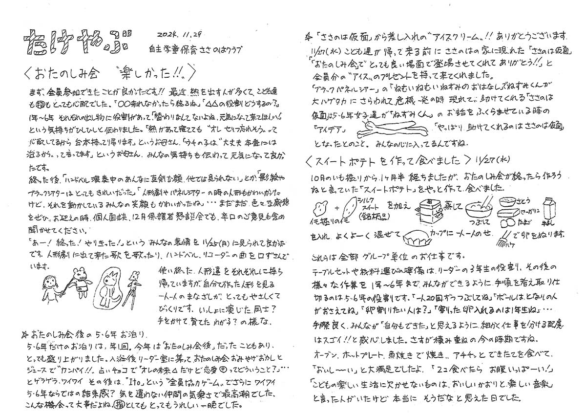 2024年11月29日 NO2 2024-11-29 最終更新日時 : 2025-03-24 sasanohaclub 楽しかったお楽しみ会の感想とスイートポテト作りの様子です。 画像をタップするとPDFで見れます。