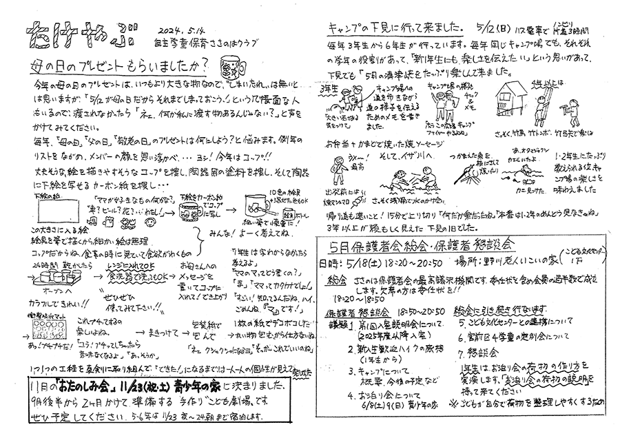2024年5月14日 2024-05-14 最終更新日時 : 2024-08-17 sasanohaclub 母の日プレゼント作りと3年生以上で行ったキャンプの下見の様子です。 画像をタップするとPDFで見れます。