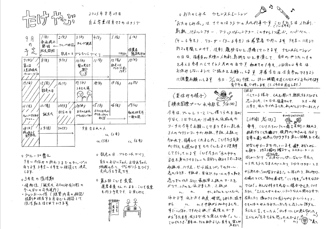 9月の予定と夏休みの様子です